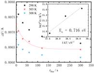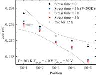 本研究创新性地结合瞬态电流分析技术与拉曼光谱测量方法,实现了对器件内部陷阱时间、空间的多维定位观测(见图2)。实验发现,在高温(363 K)和高频(1 MHz)关态应力作用下,器件中初始存在的四种不同类型的陷阱态表现出不同的响应,其中时间常数为微秒量级的界面陷阱态显著增升,而表面陷阱态表现出异常不稳定现象。通过变温、变电压实验和阿伦尼乌斯拟合分析,团队进一步确定了各陷阱态的能级和空间分布,并观测到近栅极界面深能级陷阱态的强度与时间常数不随温度发生改变,表现出向微裂纹演化的趋势。此外,研究还首次观察到表面态陷阱在无应力条件下的“预填充”现象,表现为等效能级0.716 eV的陷阱态效应,导致器件导通电流的持续下降,并影响其动态响应特性。